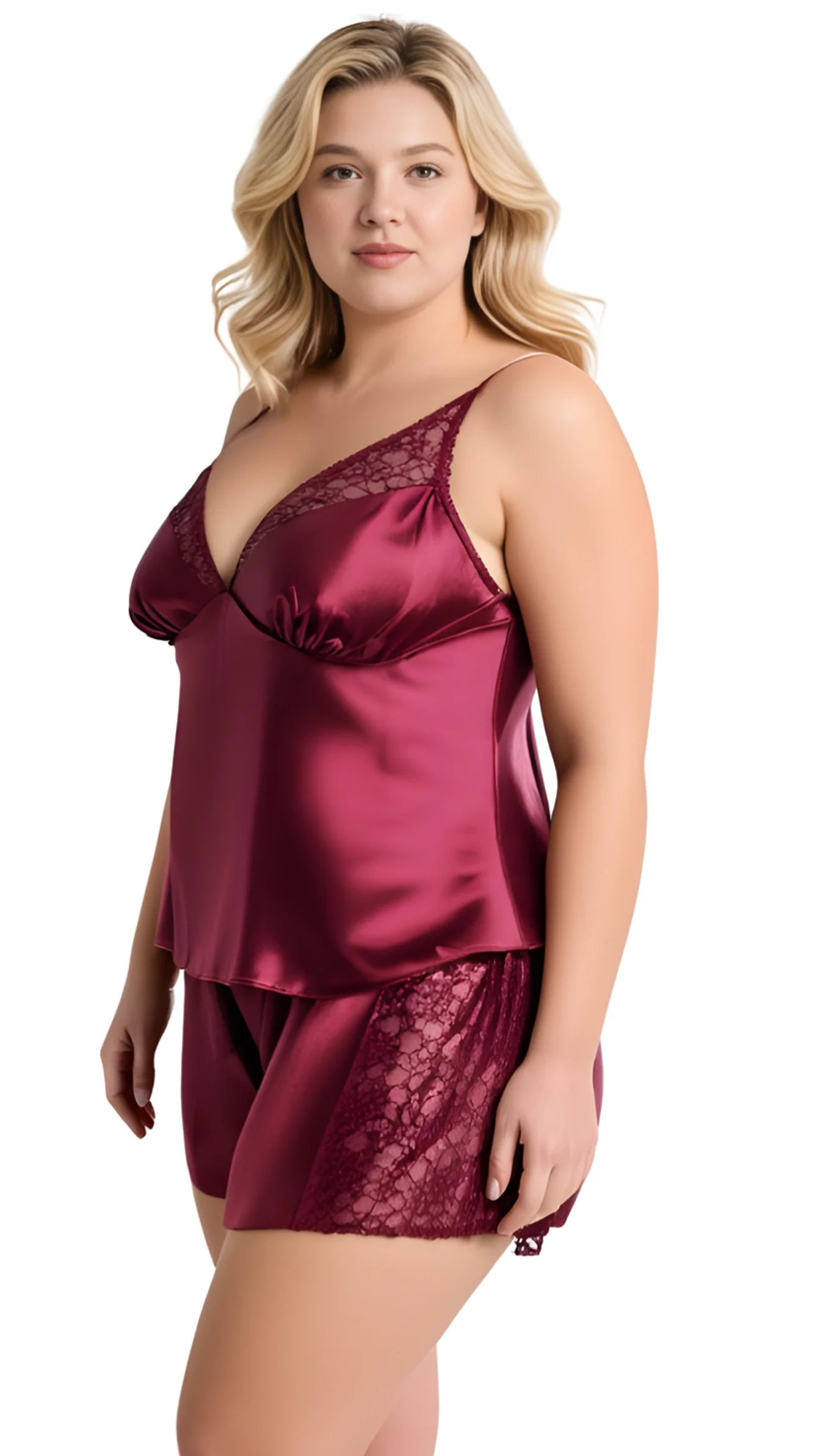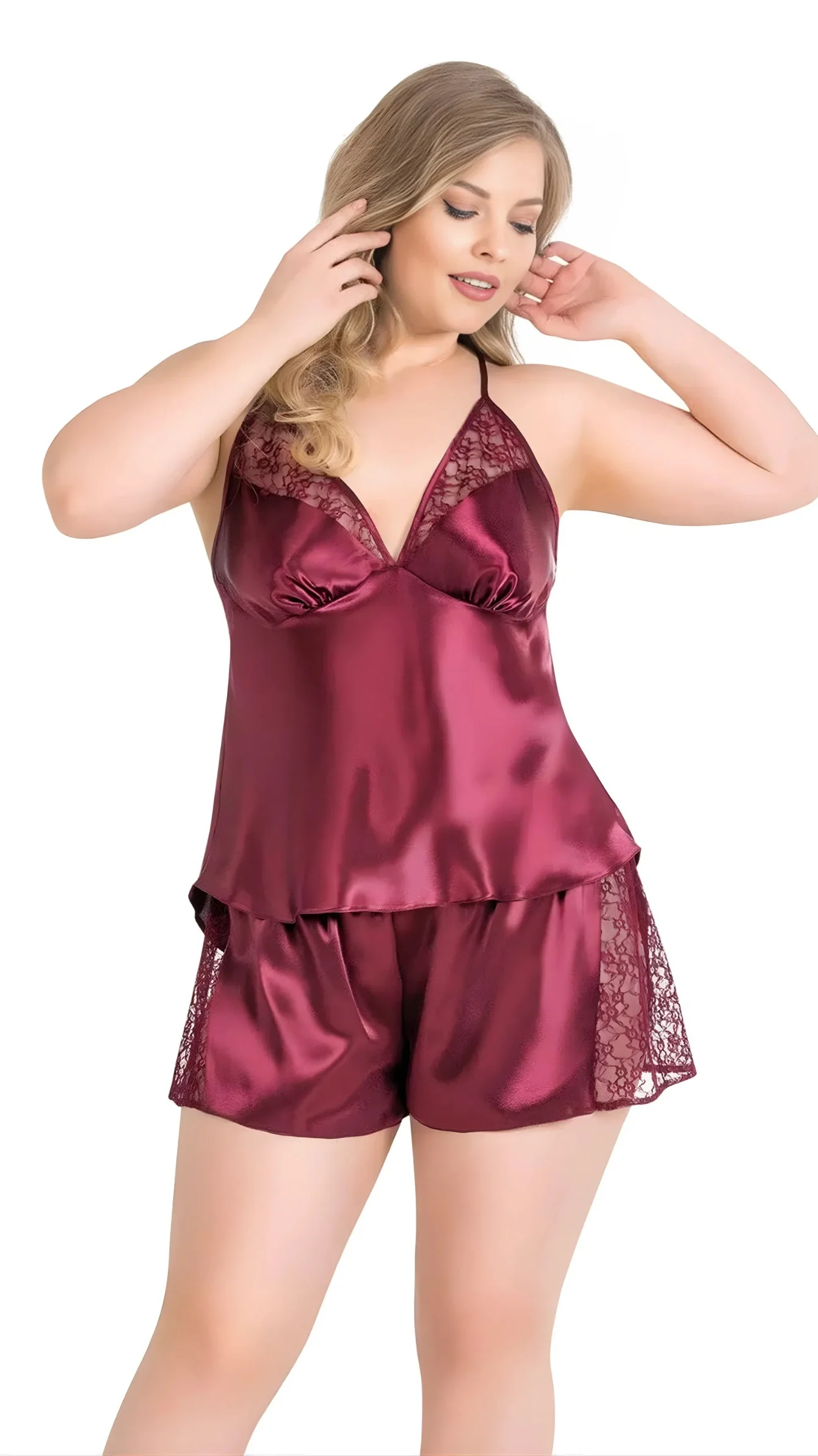 Büyük Beden Bordo Saten Babydoll Şort Takımı 1059