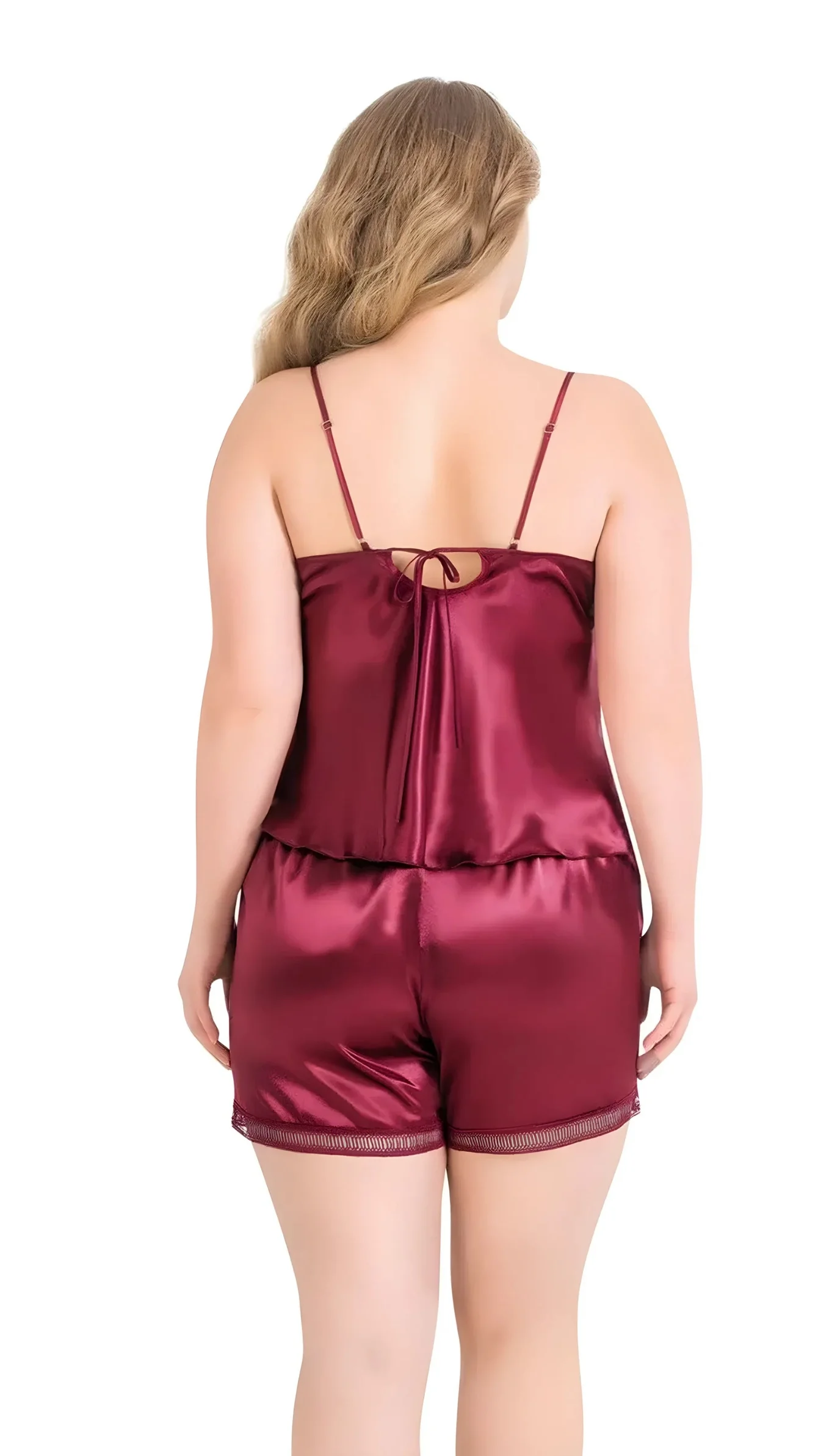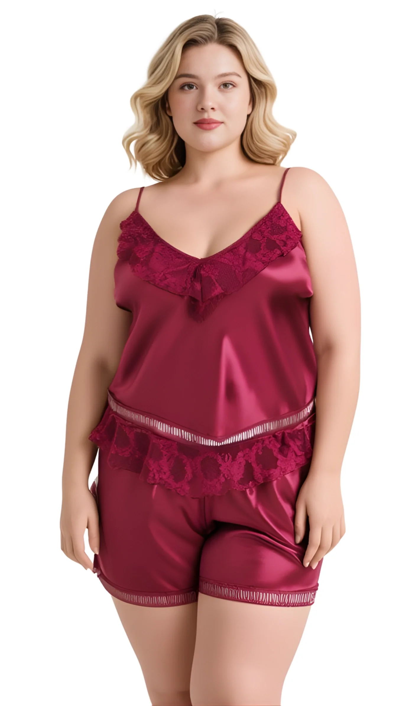 Büyük Beden Bordo Saten Babydoll Şort Takımı 1053