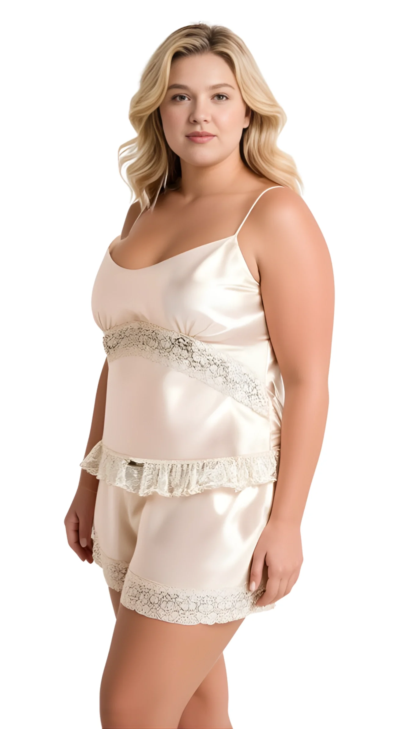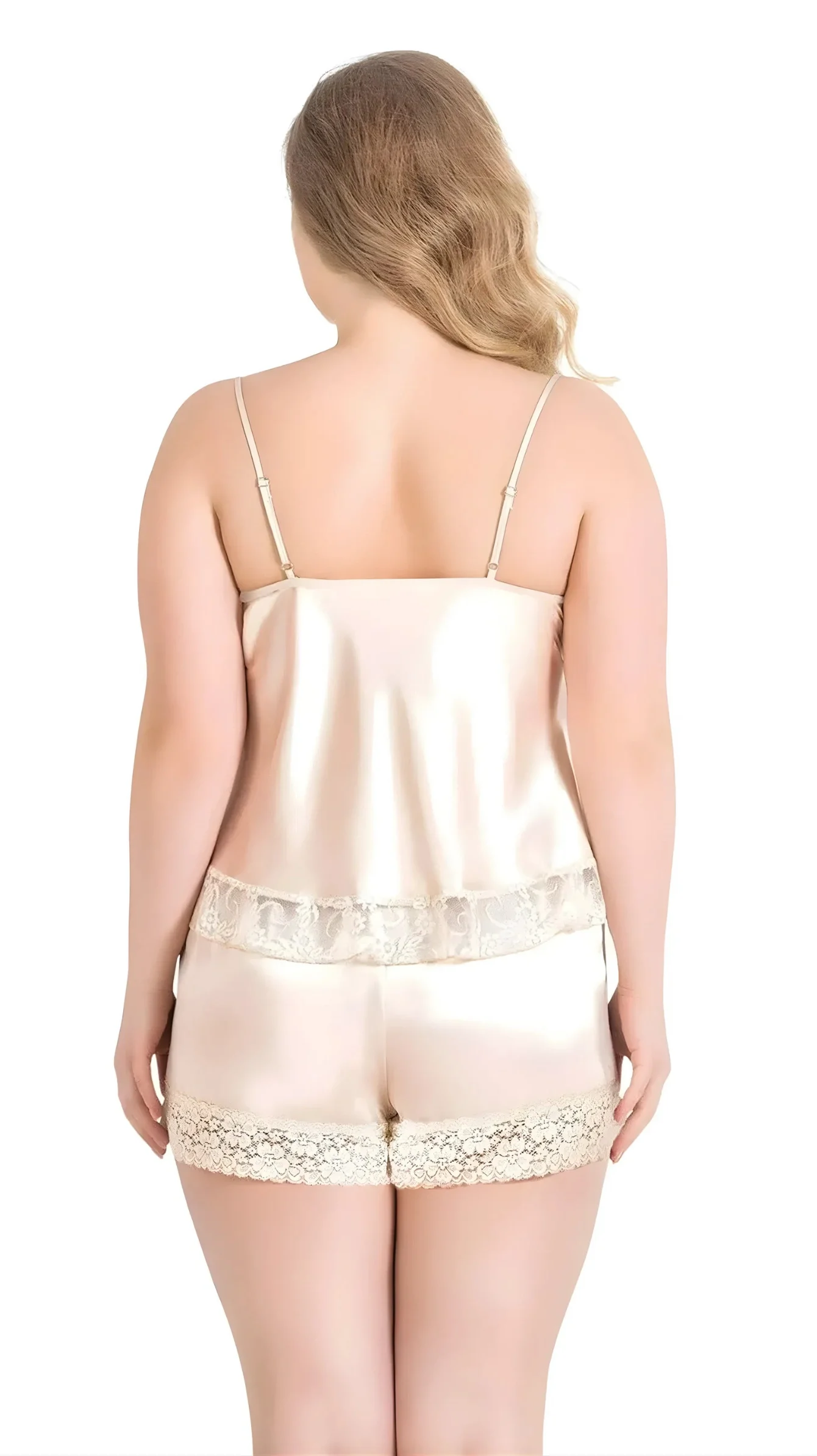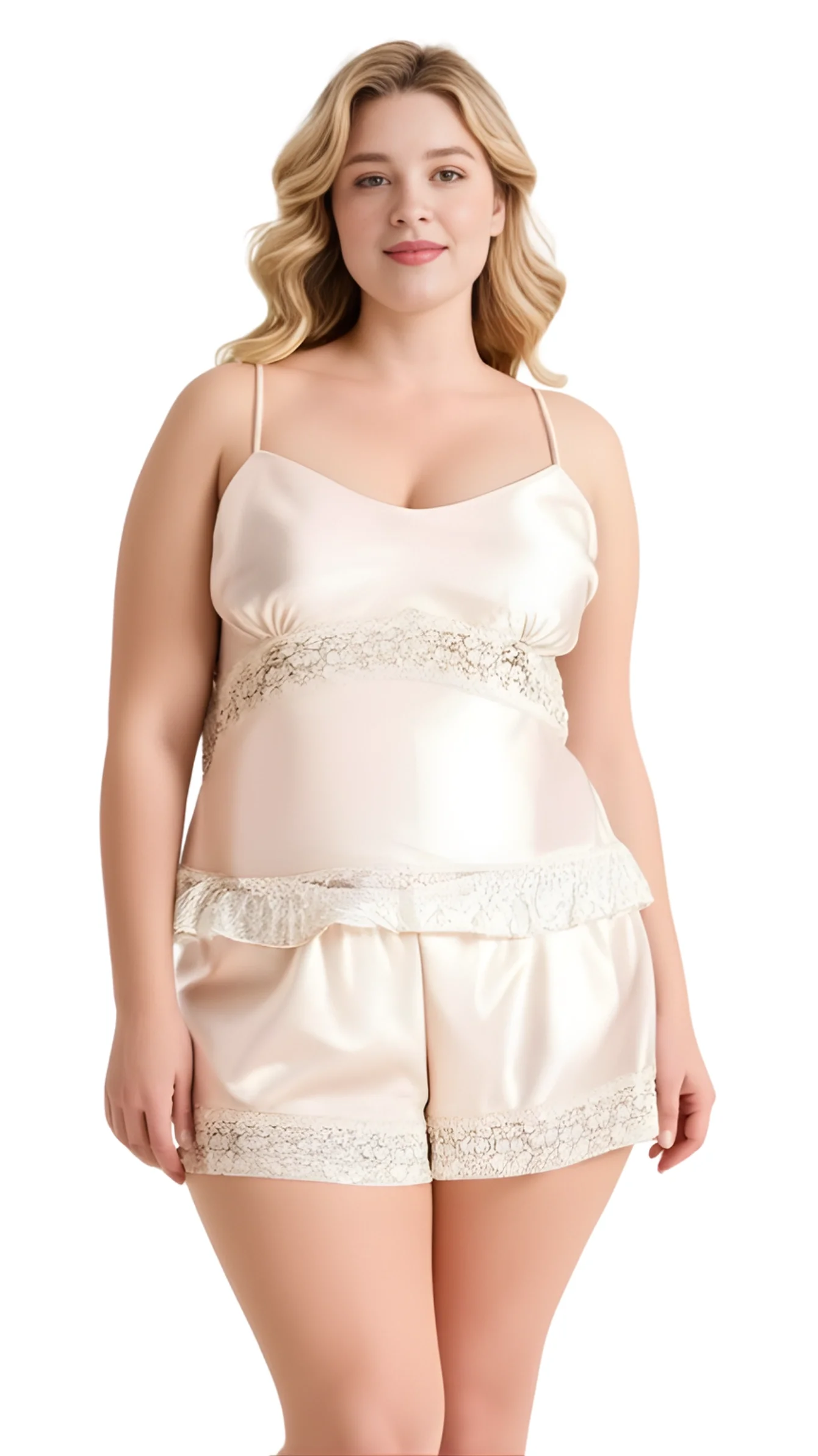 Büyük Beden Fildişi Saten Babydoll Şort Takımı 1060