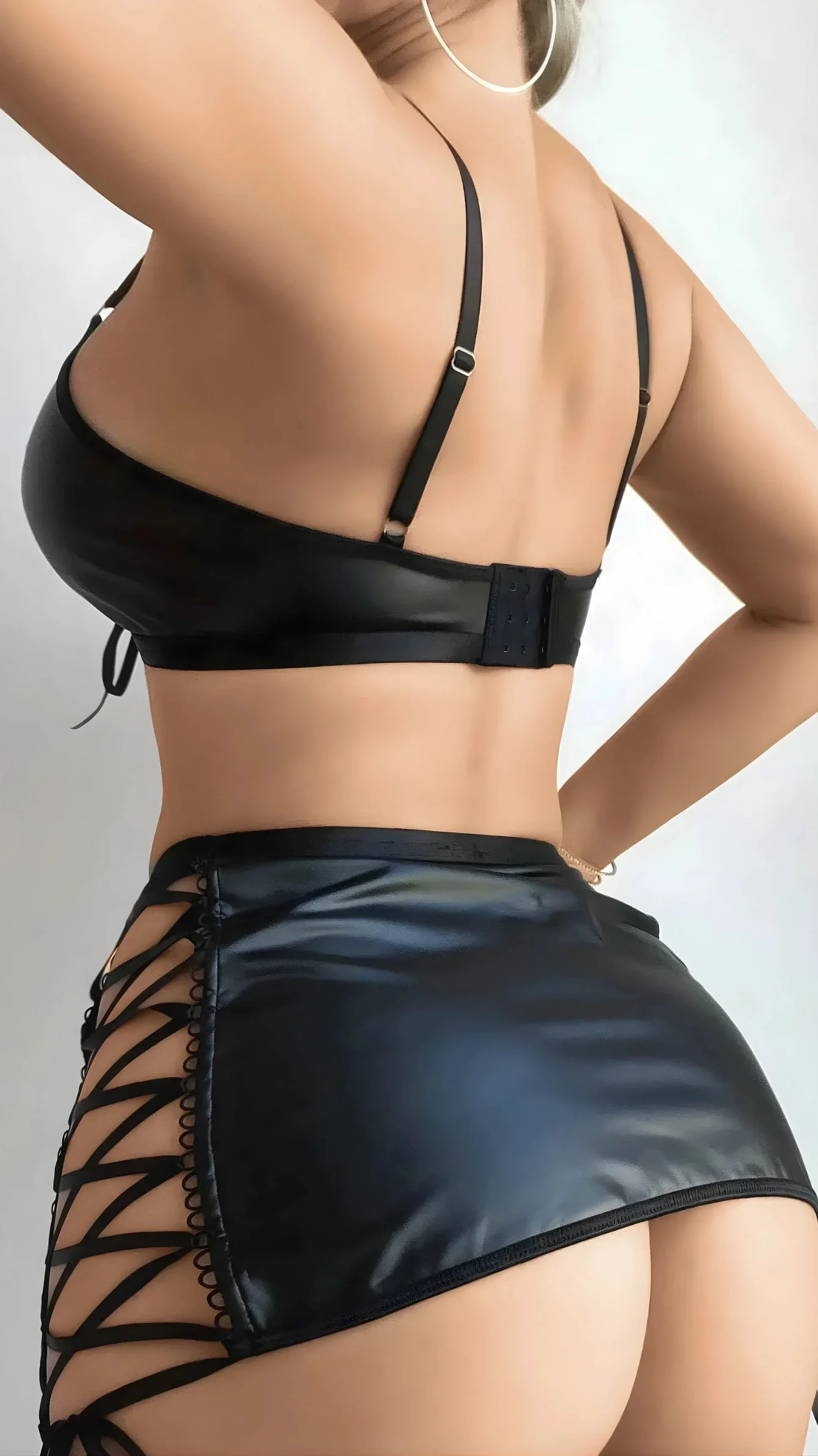Siyah lame ip detaylı etekli deri jartiyer takımı, cesur ve dikkat çekici tasarımıyla özel geceler için tasarlanmıştır. Parlak lame ip detayları ve deri görünümlü kumaşı ile güçlü ve iddialı bir stil sunar.