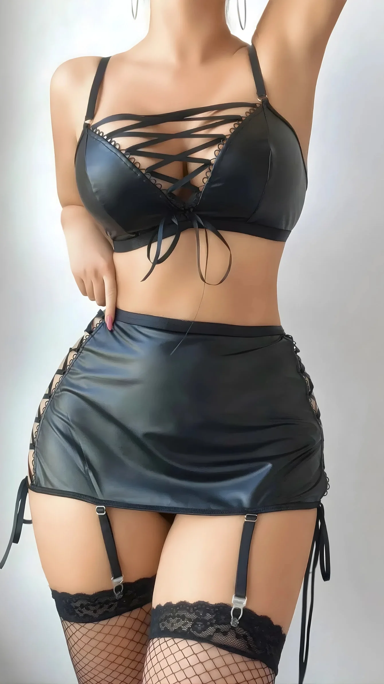 Luna Lora siyah deri jartiyer takımı; fantezi geceleri, özel anlar, rol yapma konseptleri ve bekarlığa veda organizasyonları için ideal bir tercihtir.