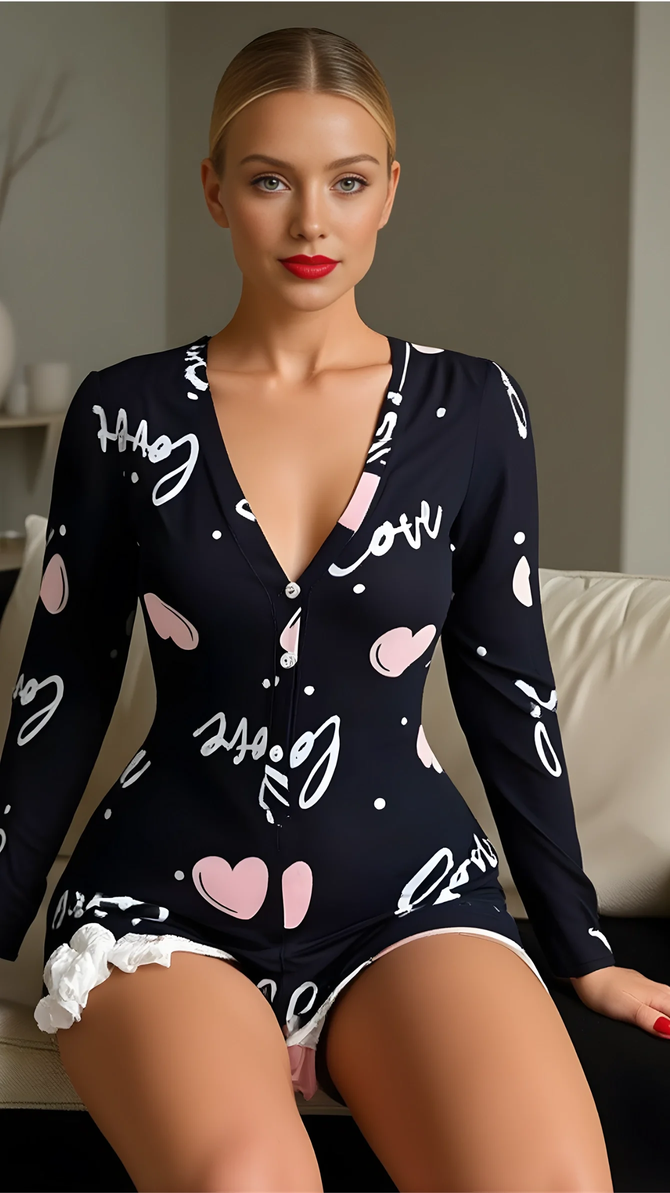 Luna Lora Black Love Heart Pamuklu Siyah Kalp Desenli Love Yazılı Düğmeli Tulum Pijama, siyah zemin üzerindeki kalp desenleri ve “Love” yazı detayıyla ev giyimine modern ve romantik bir stil kazandırır. Yumuşak pamuklu kumaşı sayesinde cilt dostudur, nefes alır ve gün boyu konfor sunar.